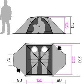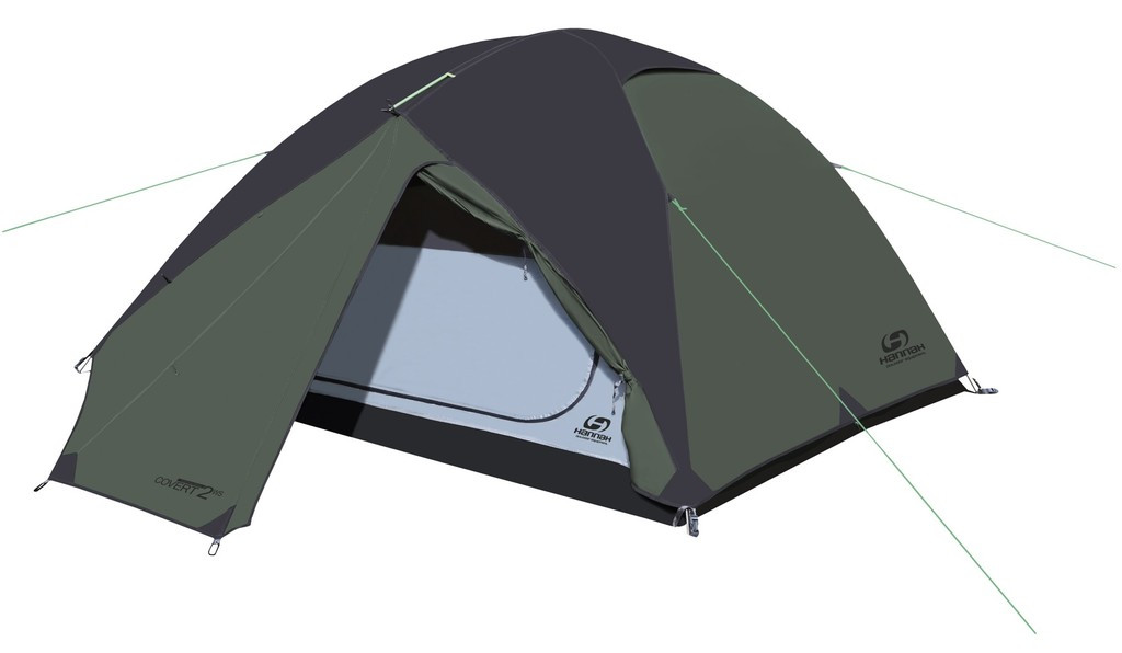 Cort pentru 2 persoane Hannah Covert 2 WS Verde/Gri cu 2 intrari, structura interioara cu fixare exterioara cu 3 bete din Dural 7001-T6, 2 ventilatii, impermeabilitate: 4000mm (folie exterioara) / 10000mm (folie sol), greutate: 3.1 kg.